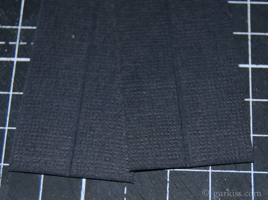 Sedan tar jag fram svart cardstock (jag har en score board men använder min fiskars skärmaskin istället) Sedan biggar jag pappret vid 1,5 cm så pappret är 3cm brett och 30,5cm långt. Två stycken sådana remsor ska du ha.